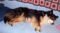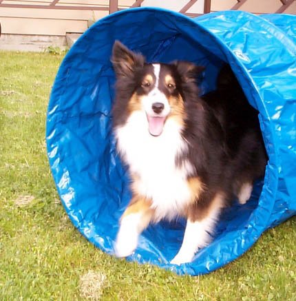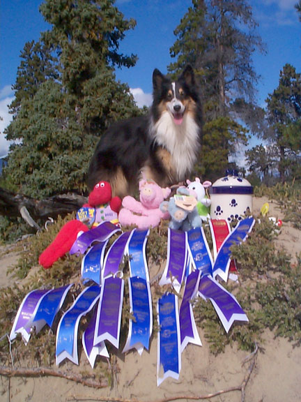 Tess with prizes and ribbons from the Whitehorse NADAC Agility Trial, Whitehorse, Yukon August 24-25, 2002